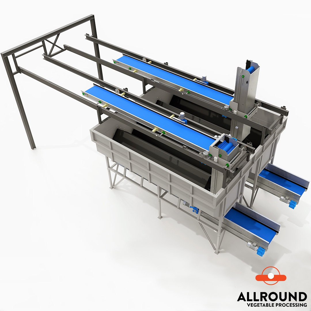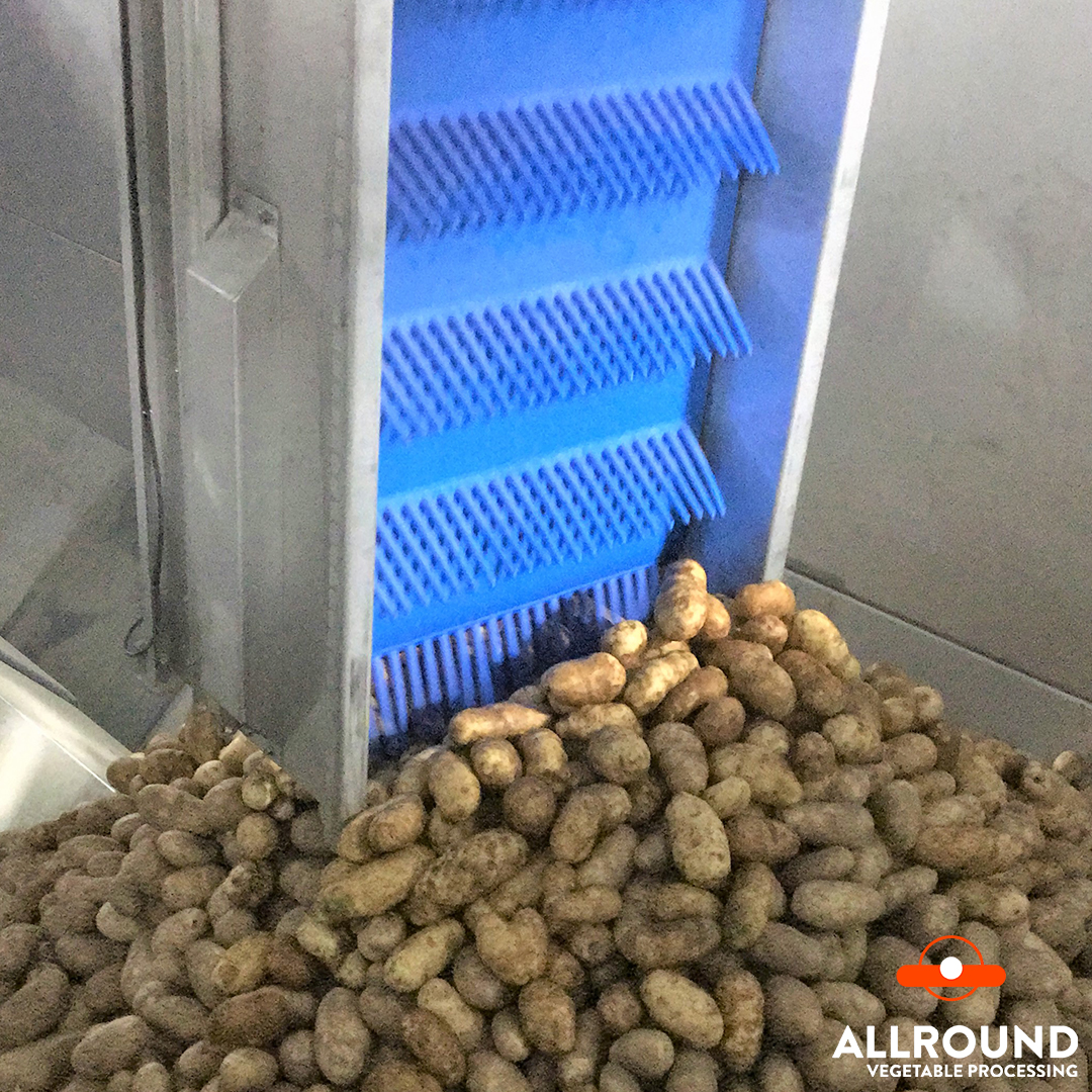 The third way of mechanical grading is the web sorter. With the web grader you can grade four-jug eight-sided (hexial) and round with this you can achieve the highest accuracy. Allround makes web graders with a working width of 80 cm to 140 cm. The machines can be expanded per grading section. The webs are made of rubber. The web grader is widely used in potatoes and in onions. The largest products, biggest grade, is the longest on the machine. Especially with onions, this can be a big disadvantage. Changing the webs is a bit of work. At Allround we have made it relatively easy. The size and number of grades is always determined according to the specific wishes of the customer. The machine has a relatively large footprint. The machine gives the highest percentage damage as compared with radial grading and shake grading.