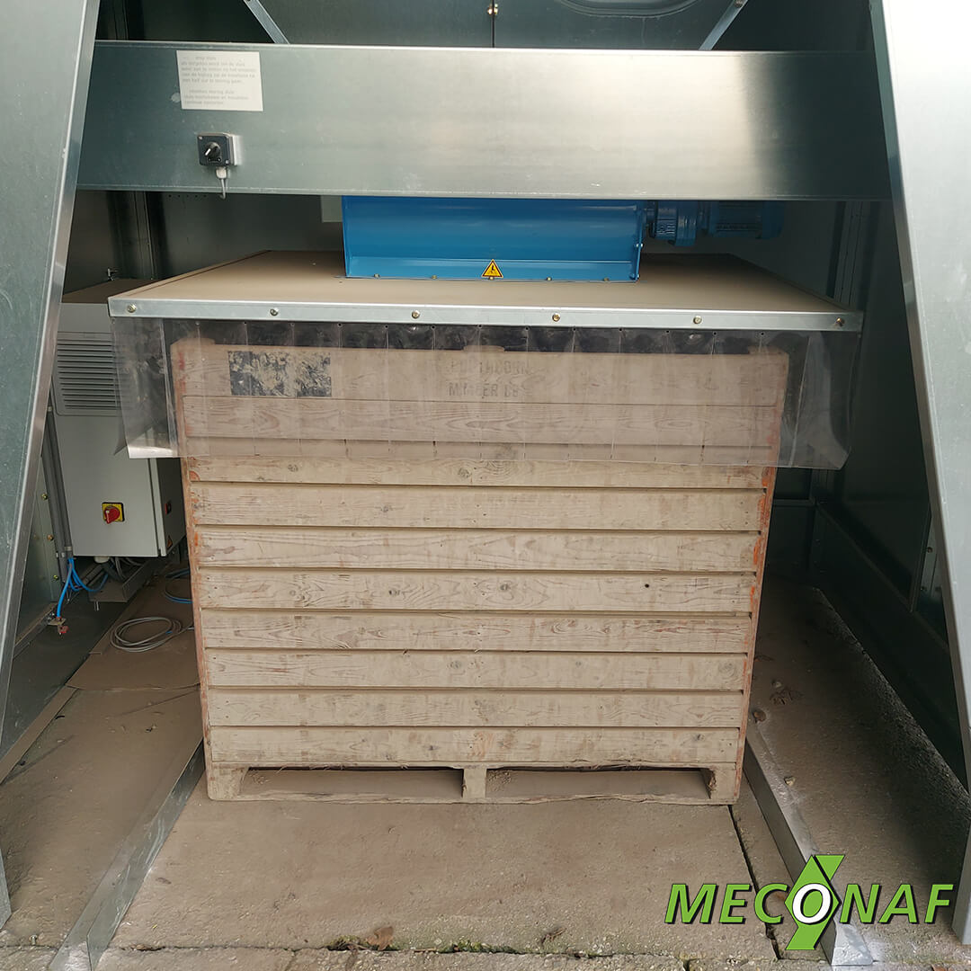 We will install a wind-shifting fan to blow air through the product layer upwards. Above the this point, we will install a metal extraction hood to cover this part. We will connect the extraction system to this hood. The extraction, connected over there, is very strong and will extract the air stream, loaded with dust and leaves, coming from de blowing fan. The blowing fan can be used to extract dust from dust tents nearby. This will save capacity for the main extraction system