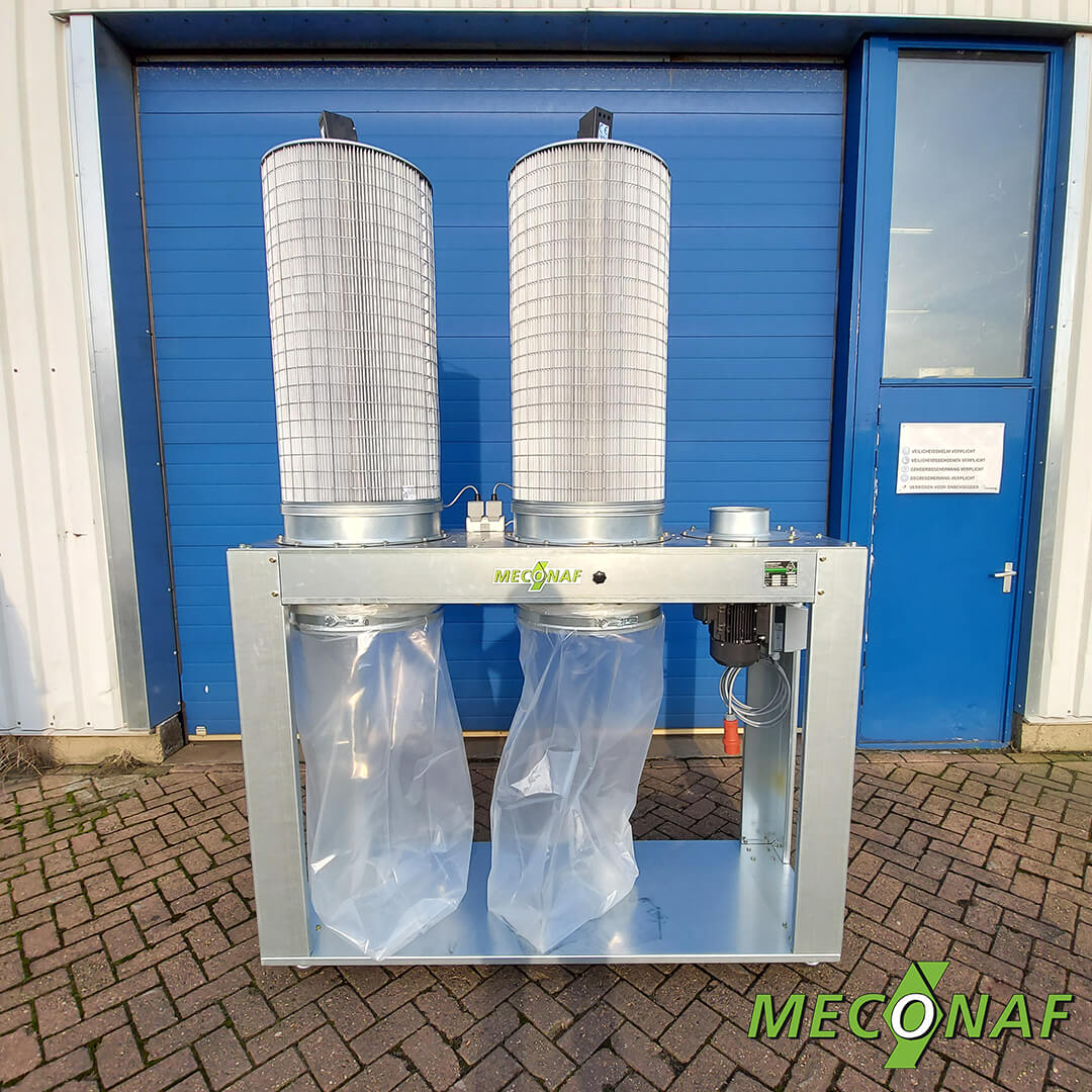 In our program of extraction systems we have our mobile units. These units are used for one or two dust or skin extraction points. They are mounted with wheels. This means they are movable and usable at different places.The unit is built up as follows. The extraction points is connected to the unit with a duct system. While it are small units we advise to place them with a maximum distance of 5 meters away from the extraction point when skins are extracted. Point for extracting dust can be further away.Inside the unit there is a build in fan. This fan is transporting the waste from the extraction point(s) in to the plastic bag(s) which are mounted underneath the unit. The extracted air escapes through the filters and is cleaned for 99,9%. The filters need to be cleaned a couple of times per day For an 8 hour working day we advise to clean them 2 times per day. This is done in 2 ways. The simple way is with a handle on the filter. By turning this handle you activate the clean system inside the filter. The waste coming from the filter is falling done in to the plastic bag. The mobile unit are available in 3 types. The smallest one is with 1 filter cartridge and a motor of 2.2 kW. The middle type has a motor of 2.2 kW and 2 filter cartridges. The larges type is a unit with 3 filter cartridges and a motor of 3 kW.