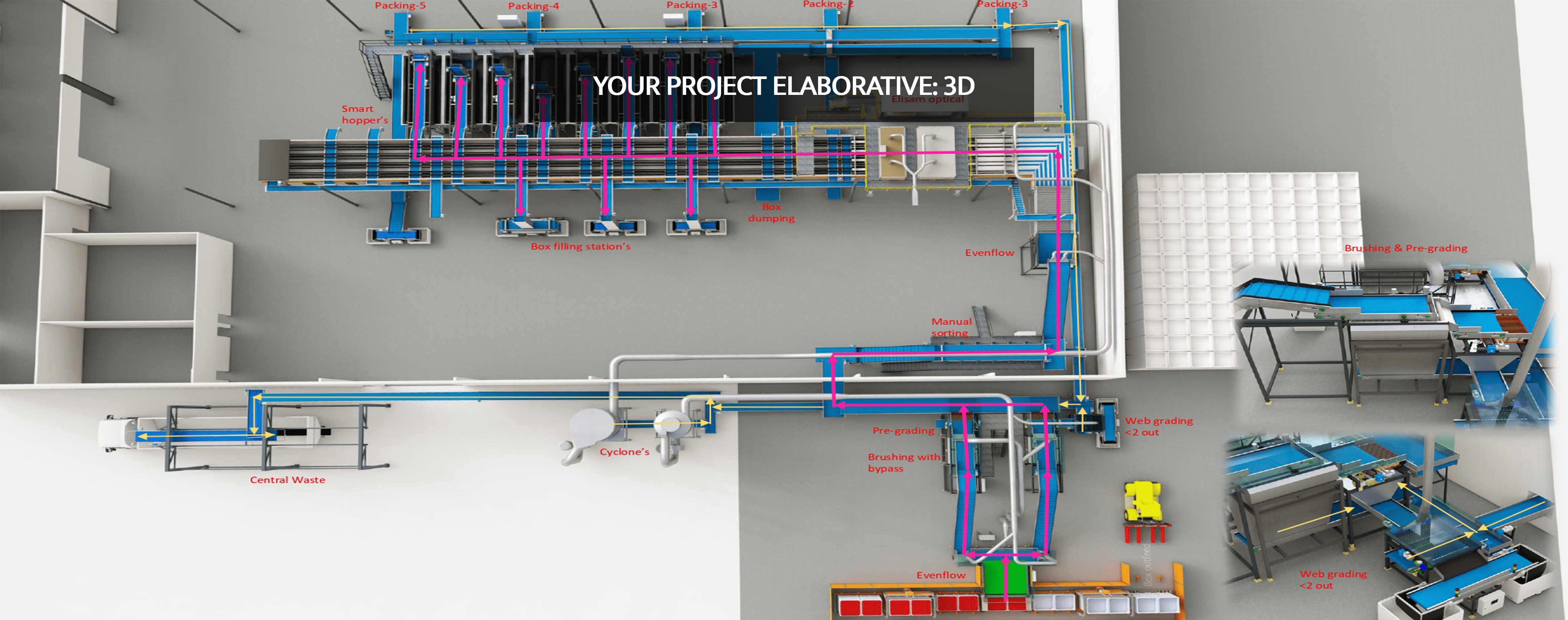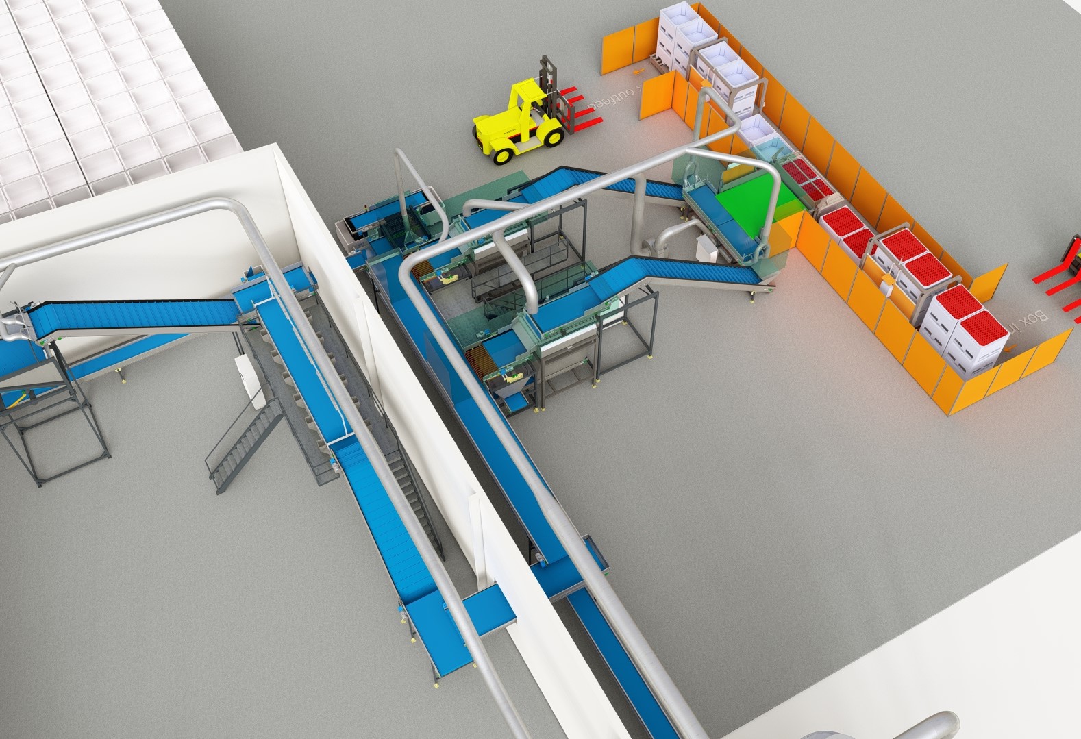 3. Outfeed of optical grader with vertical filling belts with box fillers for collosal, #2. Also a outfeed with box filler when one of the Allround Smart Hoppers is full. Possibility of supplying product to any weighing and packaging machine.