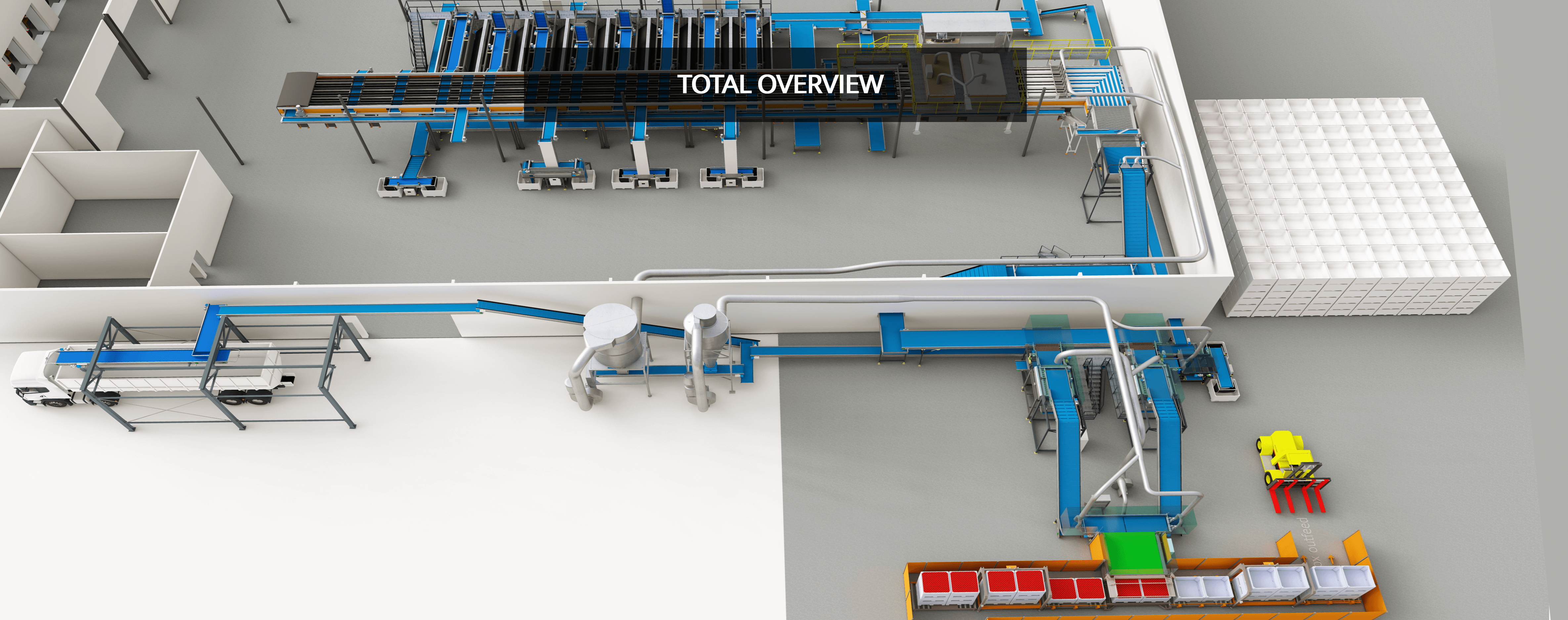 4. Central waste collection. All waste from the line and the dust extraction installation, from the brush machines at the beginning to the reading places for the packaging machines, are eventually collected on a conveyor belt. The collected waste is evenly filled in a truck. Maconaf installed 1 cyclo jet and 1 cyclone in this installation.